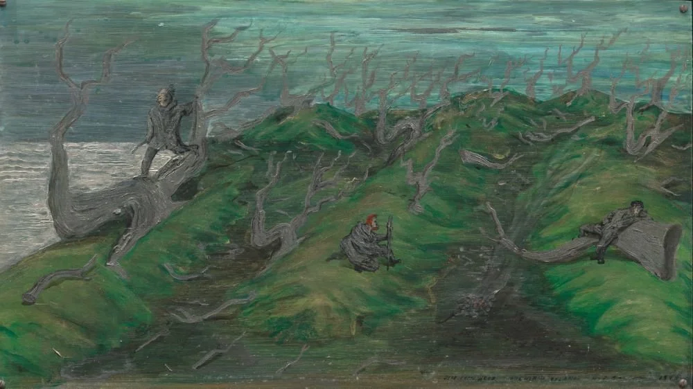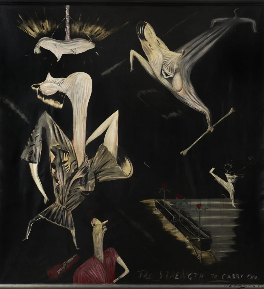 The painting is a triumph of modern Aotearoa New Zealand art, balancing visual elegance with the artist’s long-standing interest in mortality, memory and transformation. Its surface is cool and poised, echoing the elongated grace of its avian figures, even as it engages with themes that feel weighty, ancient and ritualised. We take a deep breath before entering the smoke.
