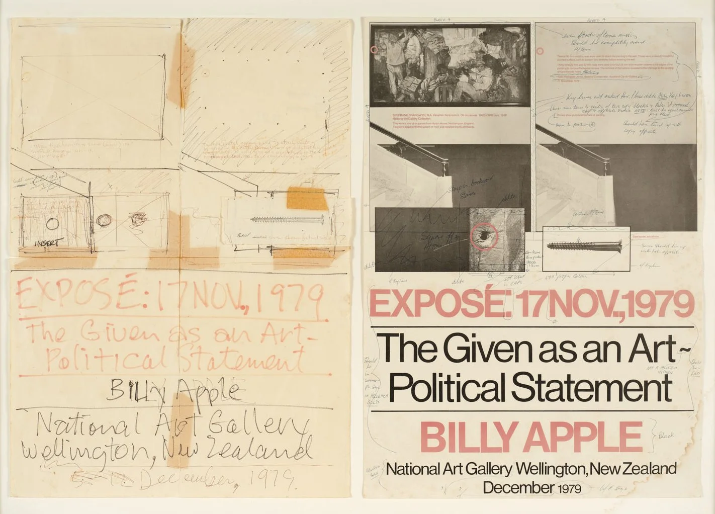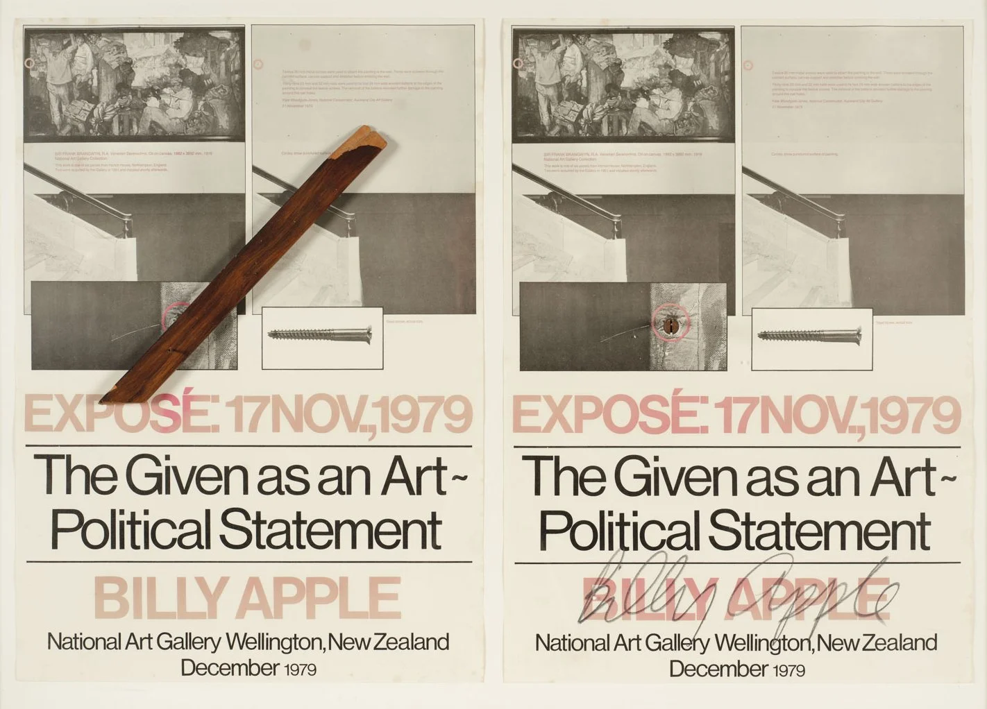 For ten months between October 1979 and March 1980, conceptual artist Billy Apple (1935–2021) returned to New Zealand from his base in New York to undertake a second ‘national tour’ – after his notorious first visit in 1975 – in which he executed a new series of site-specific installations, each subtitled The Given as an Art-Political Statement. With assistance from art writer and tour organiser Wystan Curnow, Apple delivered nine projects in public and dealer galleries in Auckland, New Plymouth, Whanganui, Wellington, Christchurch and Dunedin. In each case these entailed the artist assessing the site (what he understood as the ‘given’), proposing to the gallery owner or museum director an alteration to their space, and enlisting gallery staff and local artists to undertake the designated changes, usually in the interests of aligning it more fully with the clean lines of the modernist white cube.