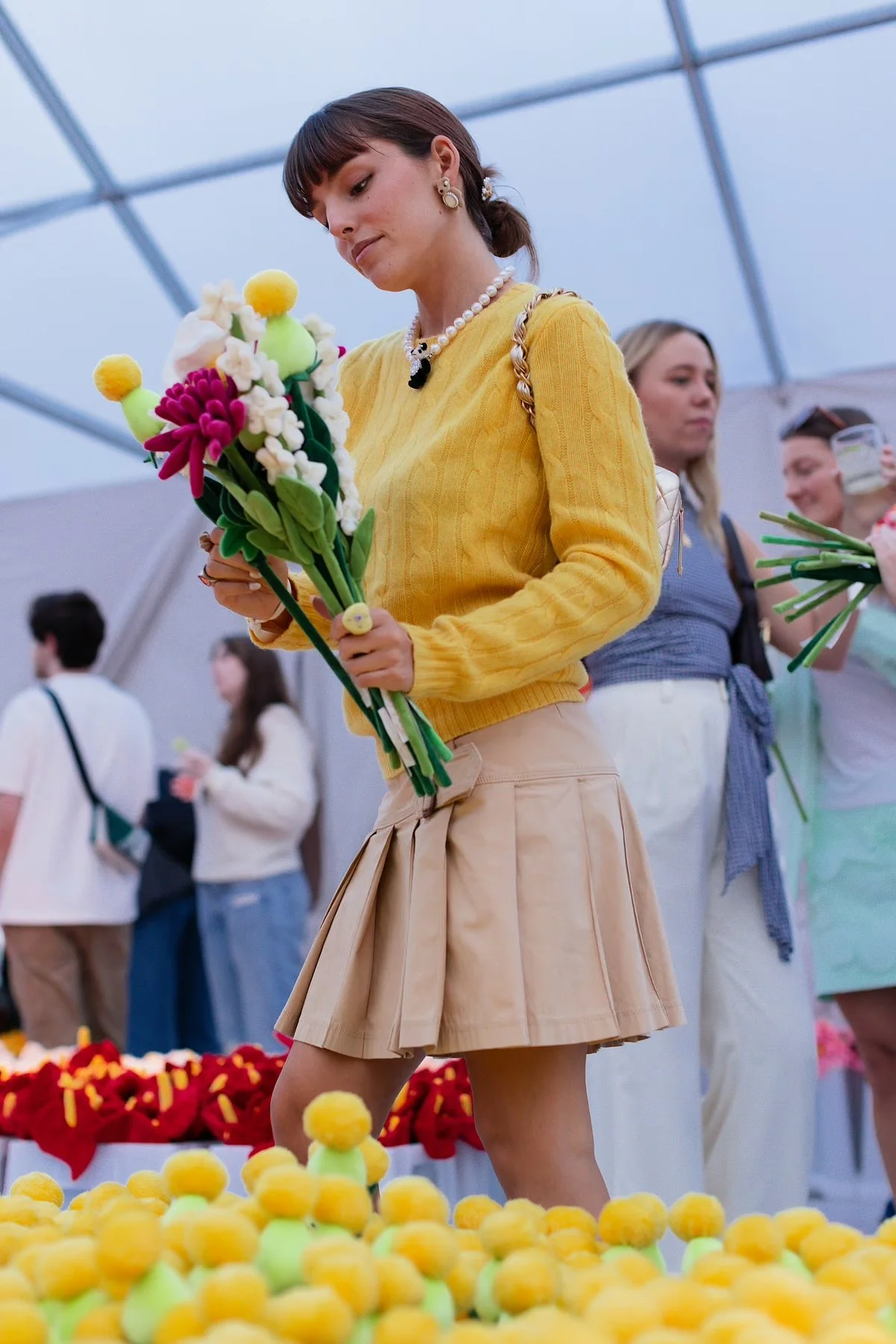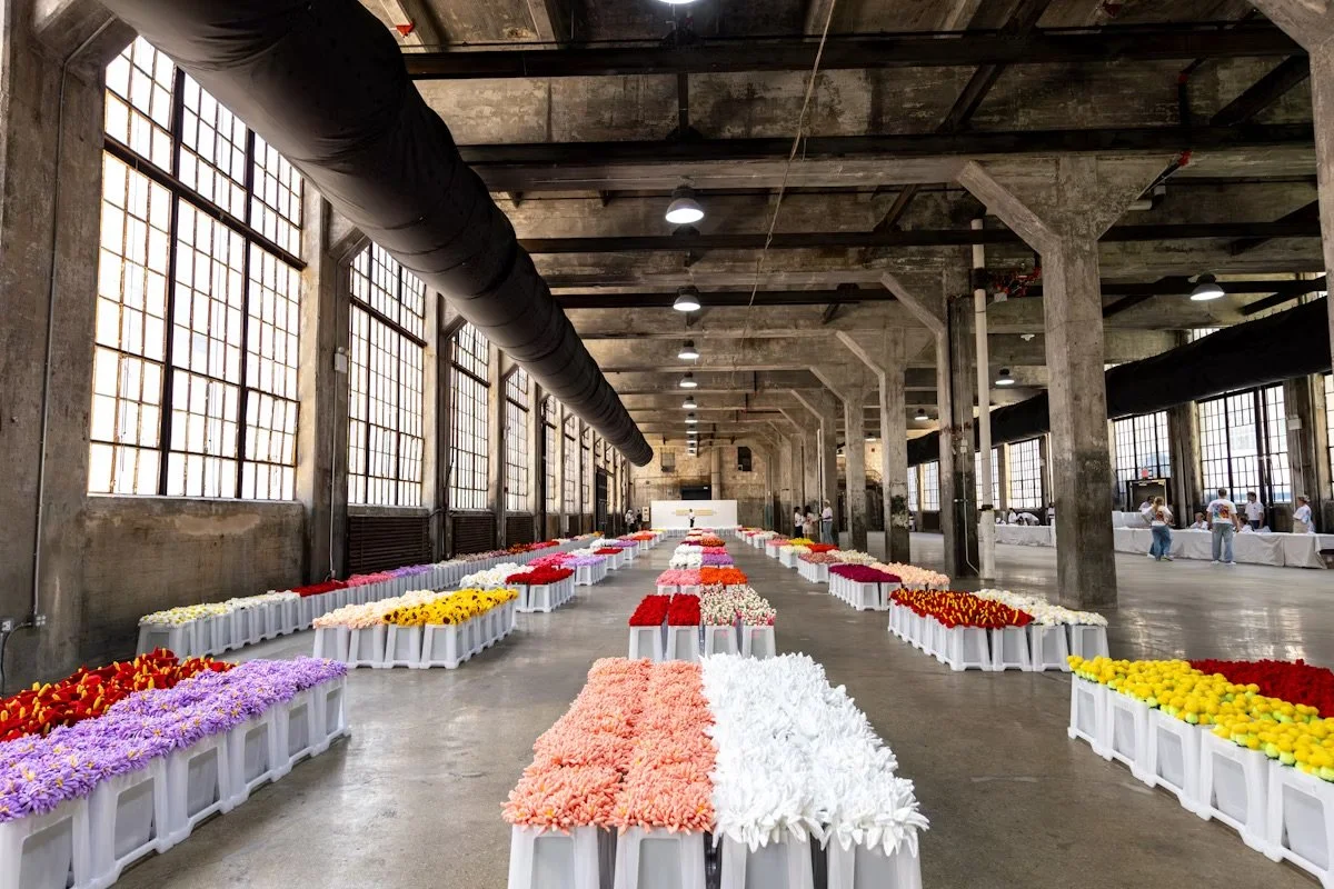 The Flower Market exhibition was originally displayed in an industrial greenhouse tent filled with boxes of plush fabric flowers, guests were invited to meander through this immersive sea of textile blooms. The overwhelming turnout famously led to the exhibition being shut down by police, before reopening in a larger industrial warehouse. This mix of humour, public reaction, craftsmanship, and large-scale experience is signature for Hendry.